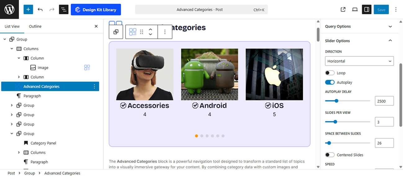 - Slides Per View: Determine how many categories are visible on the screen at once.