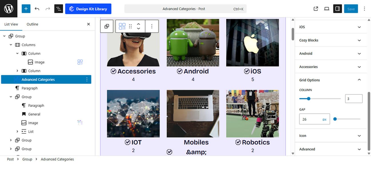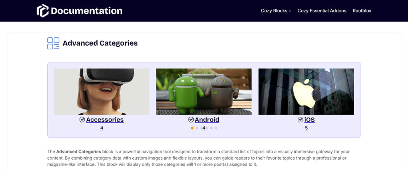 The Advanced Categories block is a powerful navigation tool designed to transform a standard list of topics into a visually immersive gateway for your content. By combining category data with custom images and flexible layouts, you can guide readers to their favorite topics through a professional or magazine-like interface. This block will display only those categories will 1 or more post(s) assigned to it.