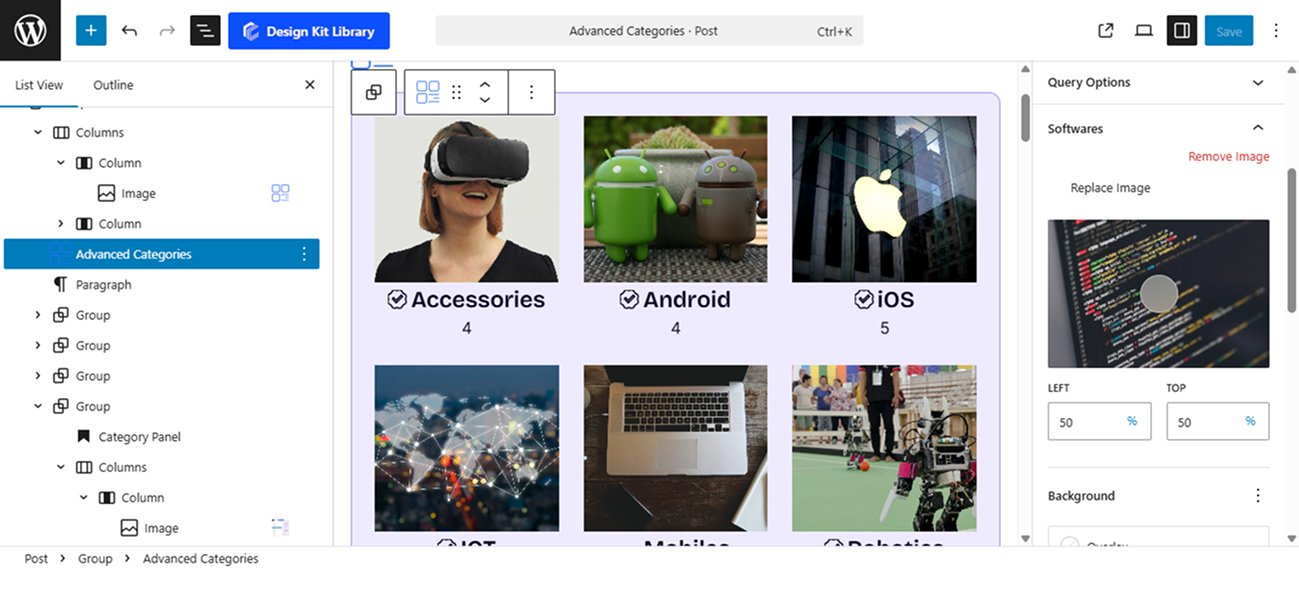 The Category Panel provides granular, individual control over each specific category. Rather than applying a blanket setting to the whole block, these options allow you to curate the unique visual identity of every category card, ensuring that each topic is represented by the perfect image and color scheme.