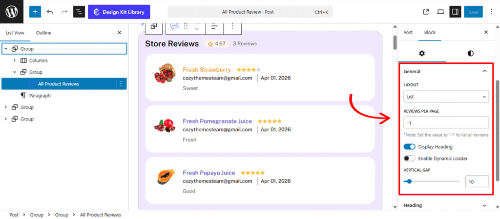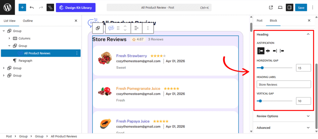 The Heading Panel provides the design controls for the section title of your reviews. This allows you to create a clear visual anchor for the All Product Review Block, ensuring your “Customer Testimonials” or “Recent Reviews” stand out with professional alignment and spacing.