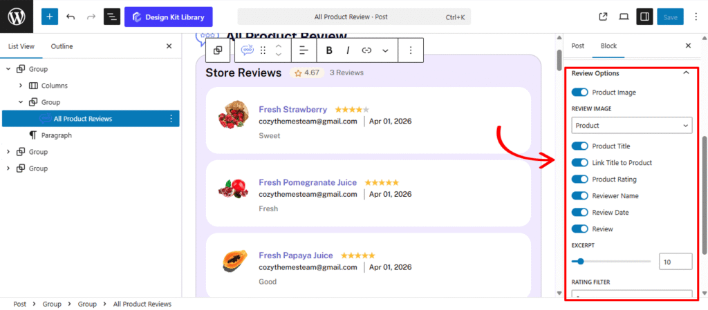 The Review Options Panel is the data-management hub for the All Product Review Block. These settings allow you to curate exactly what information is displayed for each testimonial, ensuring your social proof is both informative and visually integrated with your store’s design.