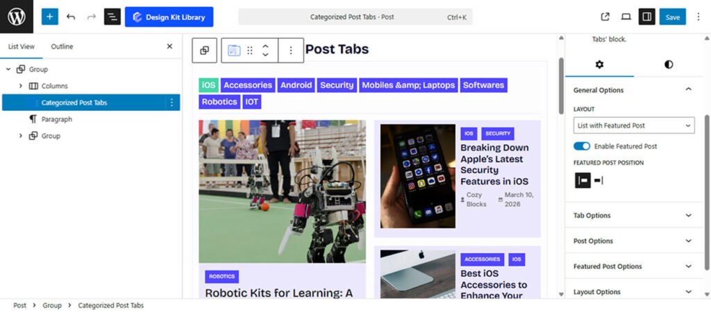 The Categorized Post Tabs block is a dynamic content solution designed to organize and display your articles through an interactive tabbed interface, allowing users to switch between categories seamlessly. This block features a professional Featured Post option that enables a magazine-style layout, where a single high-profile story is highlighted on one side while a collection of additional articles on the other. This dual-action design not only maximizes space efficiency but also creates a sophisticated editorial feel that keeps visitors engaged by offering both a focused spotlight and easy access to a broader range of content within each tab.