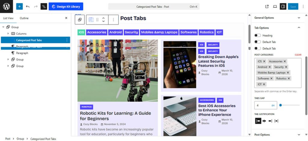 • Post Categories: Use this selection tool to pick exactly which categories you want to display as individual tabs. This allows you to curate the specific topics you want to highlight for your readers.