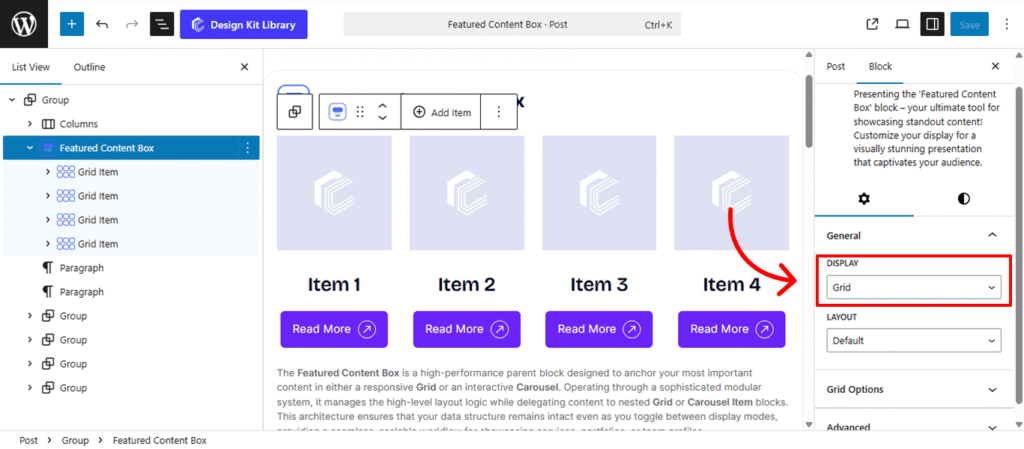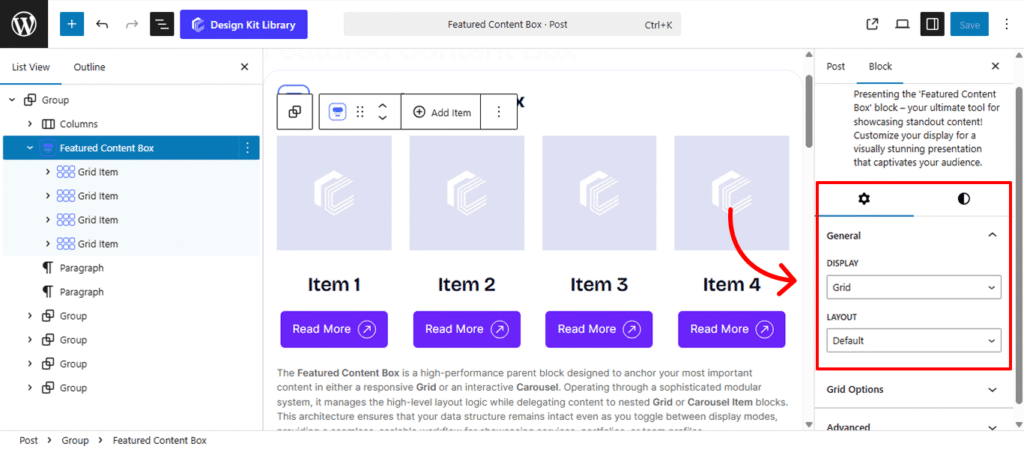 The Featured Content Box is a high-performance parent block designed to anchor your most important content in either a responsive Grid or an interactive Carousel. Operating through a sophisticated modular system, it manages the high-level layout logic while delegating content to nested Grid or Carousel Item blocks. This architecture ensures that your data structure remains intact even as you toggle between display modes, providing a seamless, scalable workflow for showcasing services, portfolios, or team profiles.