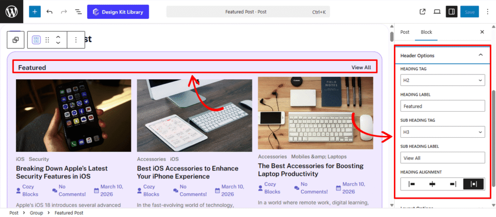 - Heading: Enable this to add a primary title to the block, such as “Featured Story” or “Editor’s Pick.”