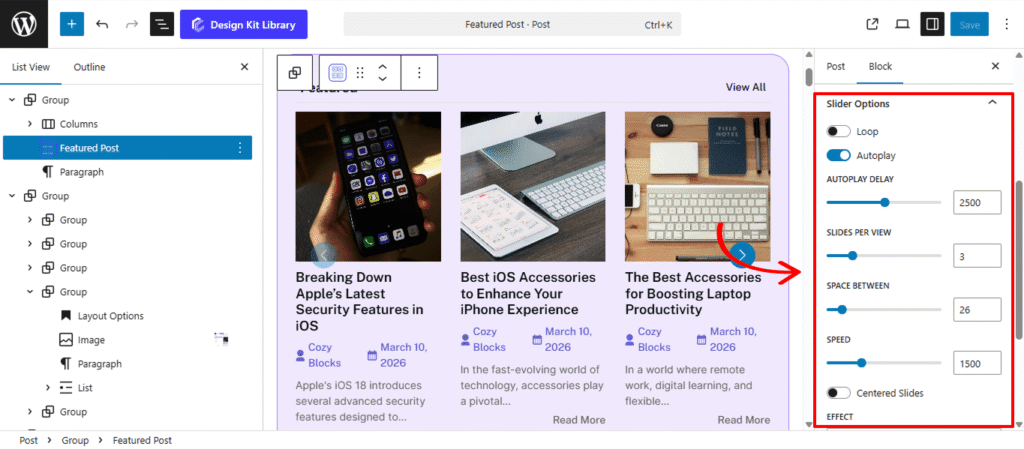 - Slides Per View: Define how many items are visible at once within the slider container. This is ideal for creating multi-column carousels or focusing on a single featured post.
