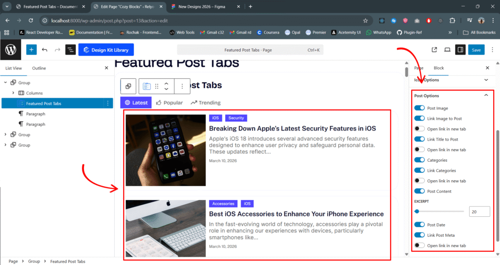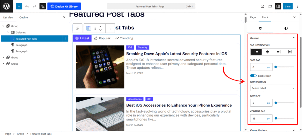 - Latest (ToggleControl): Enables the “Latest” tab to display your most recently published posts.