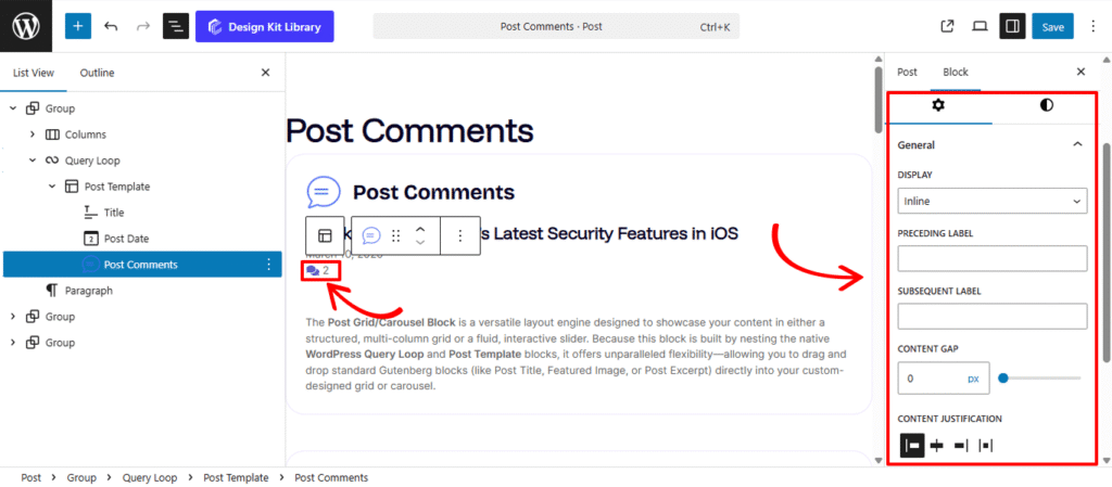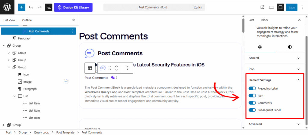 The Element Settings panel provides granular control over the visibility of each component within the Post Comment block. Since this block is nested inside a Post Template, these toggles allow you to strip back the metadata to its simplest form or build a detailed engagement string for your readers.