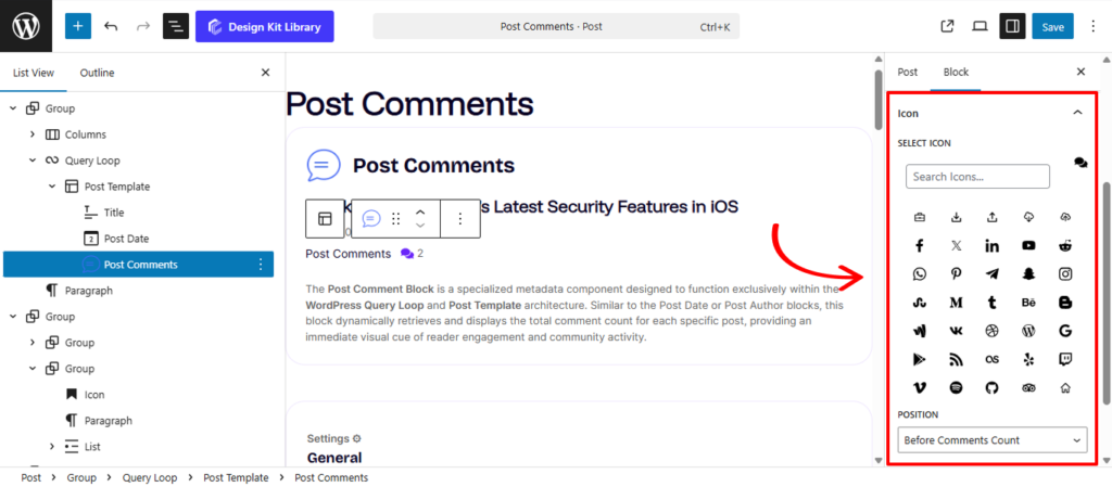 - Select Icon: Choose from a library of SVG icons to represent your comment section. Common choices include traditional speech bubbles, modern chat icons, or user group silhouettes. This icon acts as a universal signifier for “discussion” within your Post Template.